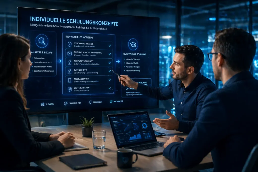 Jedes Unternehmen hat unterschiedliche Risiken und Anforderungen. Deshalb entwickeln wir Schulungskonzepte, die genau auf Ihre Organisation abgestimmt sind ,von grundlegenden IT Sicherheit Schulungen bis hin zu spezifischen Themen.